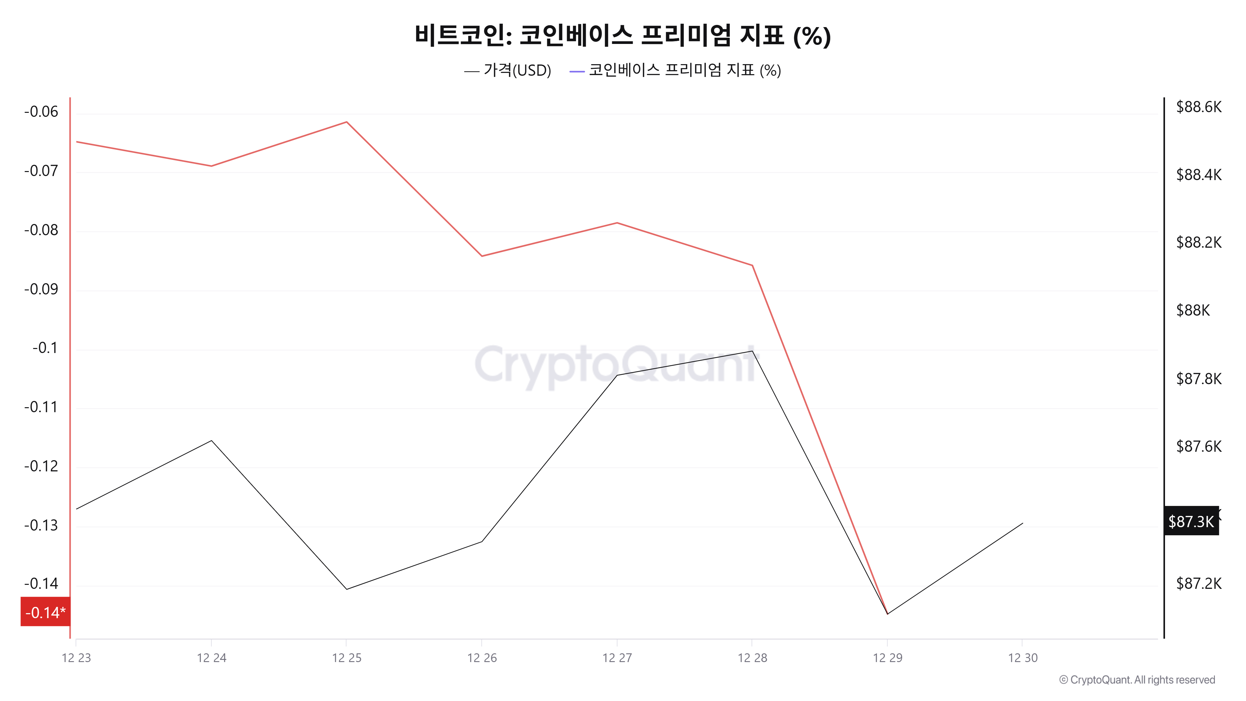 최근 일주일간 흐름을 보면 ▲12월 23일 –0.0648% ▲12월 24일 –0.0689% ▲12월 26일 –0.0842% ▲12월 27일 –0.0785% ▲12월 28일 –0.0858% ▲12월 29일 –0.1448%로 집계됐다. 프리미엄은 전 기간 동안 마이너스 구간에 머물렀으며, 특히 12월 29일 들어 낙폭이 확대되며 음의 괴리가 뚜렷해졌다.