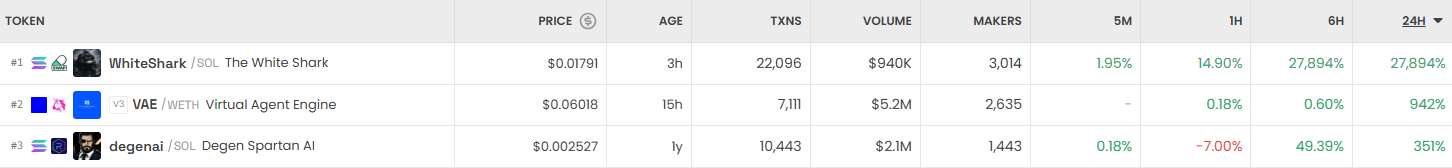 가장 크게 오른 거래쌍은 WhiteShark/SOL(The White Shark)이다. 24시간 기준 27,894% 상승, 가격은 0.01791달러로 기록됐다. 이어 VAE/WETH(Virtual Agent Engine)는 942% 상승하며 0.06018달러에 거래됐고, degenai/SOL(Degen Spartan AI)는 351% 상승하며 0.002527달러를 나타냈다.