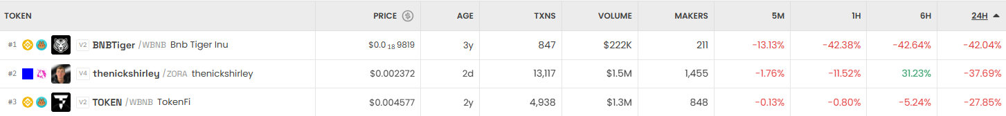 반면 가장 크게 하락한 거래쌍은 BNBTiger/WBNB(Bnb Tiger Inu)로 24시간 기준 -42.04%, 가격은 0.0189819달러로 조정받았다. thenickshirley/ZORA(thenickshirley) 역시 -37.69%를 기록했고, TOKEN/WBNB(TokenFi)는 -27.85%로 하락세를 보였다.