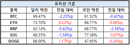 이더리움(ETH)은 달러 마진 73.70%로 0.22%포인트 감소했으며, 코인 마진은 68.71%로 0.86%포인트 상승했다. XRP는 달러 마진 62.14%로 0.42%포인트 하락했고, 코인 마진은 66.77%로 2.38%포인트 낮아졌다.