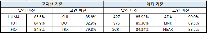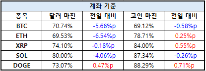 이더리움(ETH)은 달러 마진 69.53%로 6.54%포인트 낮아졌으며, 코인 마진은 78.71%로 0.25%포인트 상승했다. XRP는 달러 마진 74.10%로 0.18%포인트 하락했고, 코인 마진은 84.00%로 0.55%포인트 증가했다.