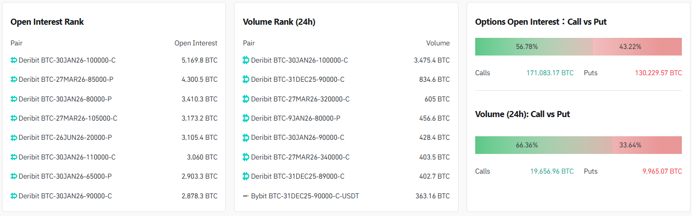 24시간 거래량 기준 상위 계약은 ▲10만 달러 콜옵션(2026년 1월 30일) ▲9만 달러 콜옵션(2025년 12월 31일) ▲32만 달러 콜옵션(2026년 3월 27일) 순으로 집계되며, 단기 거래 역시 고행사가 콜옵션을 중심으로 활발하게 이뤄졌다.