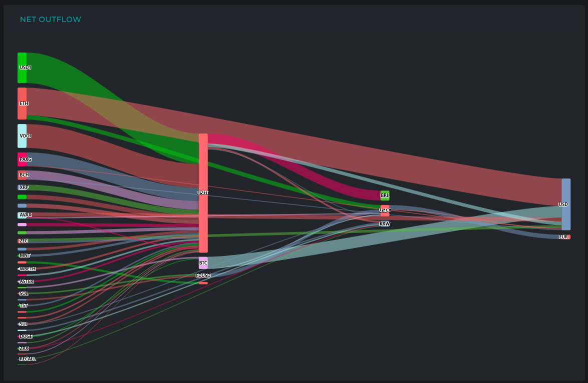 BCH 역시 1040만 달러가 빠져나가며 960만 달러가 USDT로, 86만 달러가 달러화로 재배치됐다. XRP에서는 610만 달러가 USDT로 유출됐다.