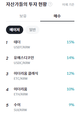 빗썸 집계에 따르면 테더가 15%로 가장 높은 매수 비중을 기록했다. 유에스디코인은 14%로 뒤를 이었으며, 이더리움 클래식은 12%, 이더리움은 10%, 수이는 9%를 기록하며 상위권을 형성했다. 스테이블코인과 주요 메이저 코인을 중심으로 한 안정적 매수 흐름이 이어지는 모습이다.