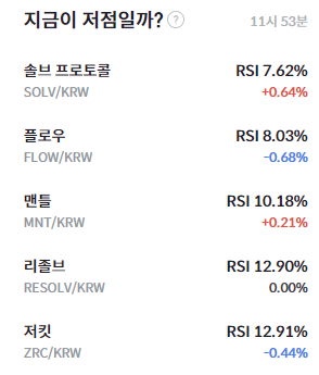 이 외에도 플로우(FLOW), 멘틀(MNT), 리졸브(RESOLV), 저킷(ZRC) 등 다수 종목이 RSI 30 이하의 과매도 구간에 머물고 있다. 특히 솔브 프로토콜은 RSI가 한 자릿수 초반 수준으로 낮아지며 단기 기술적 반등 가능성이 거론된다.