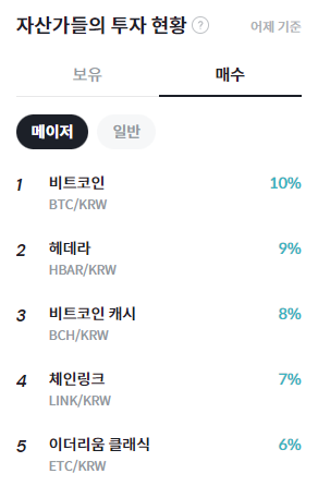 빗썸 집계에 따르면 비트코인이 10%로 가장 높은 매수 비중을 기록했다. 헤데라는 9%로 뒤를 이었으며, 비트코인 캐시는 8%, 체인링크는 7%, 이더리움 클래식은 6%를 기록하며 상위권을 형성했다. 메이저 코인과 시가총액 상위 알트코인을 중심으로 한 비교적 안정적인 매수 흐름이 나타난 모습이다.