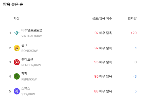 공포·탐욕 지수에서도 VIRTUAL은 97포인트로 전체 가상자산 가운데 최상위권을 기록했다. 같은 지표에서 봉크(BONK)와 렌더토큰(RENDER) 역시 97포인트와 95포인트를 나타내며 탐욕 구간에 위치했다.