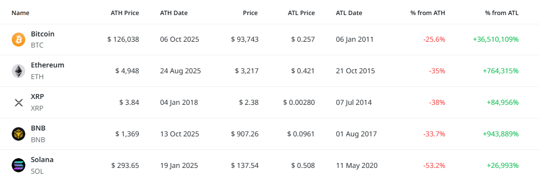 현재가 9만3743달러 | ATH 12만6038달러 (–25.6%)