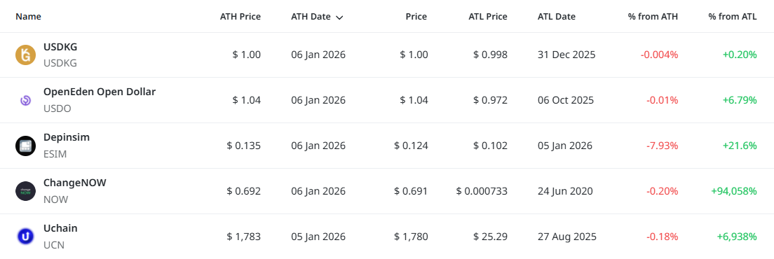 이번 신고점 근접 종목들은 스테이블코인 또는 결제·인프라 성격의 토큰이 다수를 차지했다는 점이 특징이다. 달러 연동 자산은 가격 변동성 없이 유통·신뢰 지표 측면에서 신고점을 경신하는 흐름이 나타났다. 비스테이블 종목 중에서는 ESIM이 상대적으로 큰 조정을 받았으나, 나머지 종목들은 ATH 인근에서 가격을 유지하고 있다. 전반적으로 투기적 급등보다는 구조적 수요와 유동성 확장이 반영된 움직임으로 해석된다.