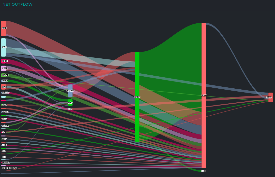 법정화폐와 스테이블코인 자금이 BTC로 재집중되는 한편 일부 알트코인에서는 차익 실현과 현금화 흐름이 동시에 포착됐다.