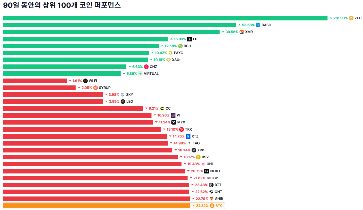 6일 오후 3시 10분 기준 비트코인은 전일 대비 1.4% 상승한 9만3640달러에 거래됐다. 90일 누적 수익률은 -22.82%를 가리키고 있다.