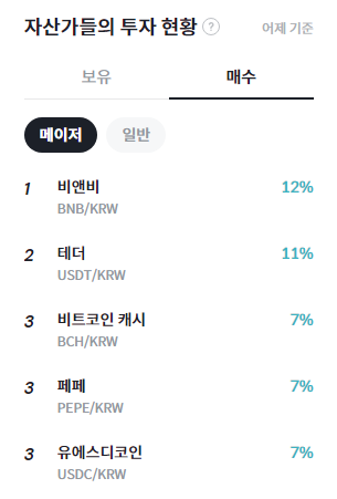 빗썸 집계에 따르면 비앤비가 12%로 가장 높은 매수 비중을 기록했다. 테더는 11%로 뒤를 이었으며, 비트코인 캐시와 페페, 유에스디코인은 각각 7%를 기록하며 공동 상위권에 올랐다. 메이저 코인과 스테이블코인을 중심으로 한 방어적 매수 흐름이 나타나는 모습이다.