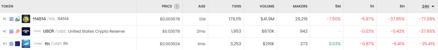 반면 가장 크게 하락한 거래쌍은 114514/SOL (114514)로 24시간 기준 -77.08%, 가격은 0.003678달러로 조정받았다. USCR/USDC (United States Crypto Reserve) 역시 -37.65%를 기록했고, fih/USD1 (fih)는 -25.41%로 하락세를 보였다.