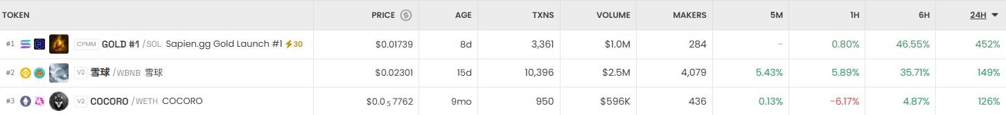가장 크게 오른 거래쌍은 GOLD #1/SOL (Sapien.gg Gold Launch #1)이다. 24시간 기준 452% 상승했으며, 가격은 0.01739달러로 기록됐다. 이어 雪球/WBNB (雪球)는 149% 상승하며 0.02301달러에 거래됐고, COCORO/WETH (COCORO)는 126% 오르며 0.00057762달러를 나타냈다.