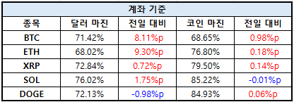 이더리움(ETH)은 달러 마진 68.02%(+9.30%p), 코인 마진 76.80%(+0.18%p)를 기록했다. XRP는 달러 마진 72.84%(+0.72%p), 코인 마진 79.50%(+0.14%p)로 집계됐다.