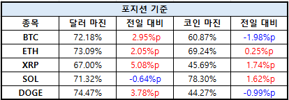 솔라나(SOL)는 달러 마진 71.32%(-0.64%p), 코인 마진 78.30%(+1.62%p)로 집계됐다. 도지코인(DOGE)은 달러 마진 74.47%(+3.78%p), 코인 마진 44.27%(-0.99%p)를 기록했다.