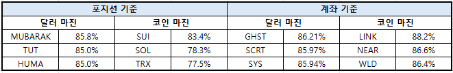 솔라나(SOL)는 달러 마진 76.02%(+1.75%p), 코인 마진 85.22%(-0.01%p)를 나타냈다. 도지코인(DOGE)은 달러 마진 72.13%(-0.98%p), 코인 마진 84.93%(+0.06%p)로 확인됐다.
