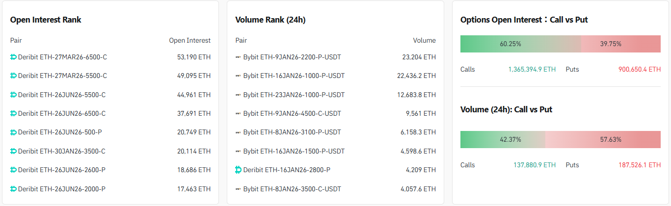24시간 거래량 기준 상위 계약은 ▲2200달러 풋옵션(2026년 1월 9일·바이비트) ▲1000달러 풋옵션(2026년 1월 16일·바이비트) ▲1000달러 풋옵션(2026년 1월 23일·바이비트) ▲4500달러 콜옵션(2026년 1월 9일·바이비트) ▲3100달러 풋옵션(2026년 1월 8일·바이비트) 순으로 나타나, 단기 거래가 하단 행사가 중심으로 집중됐다.