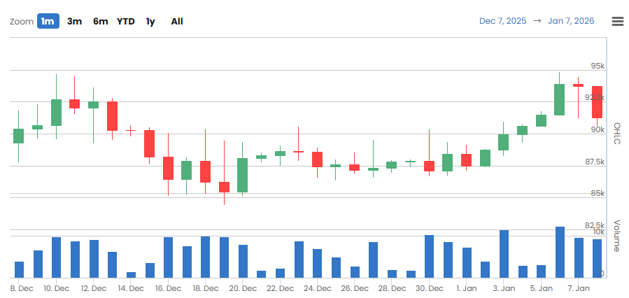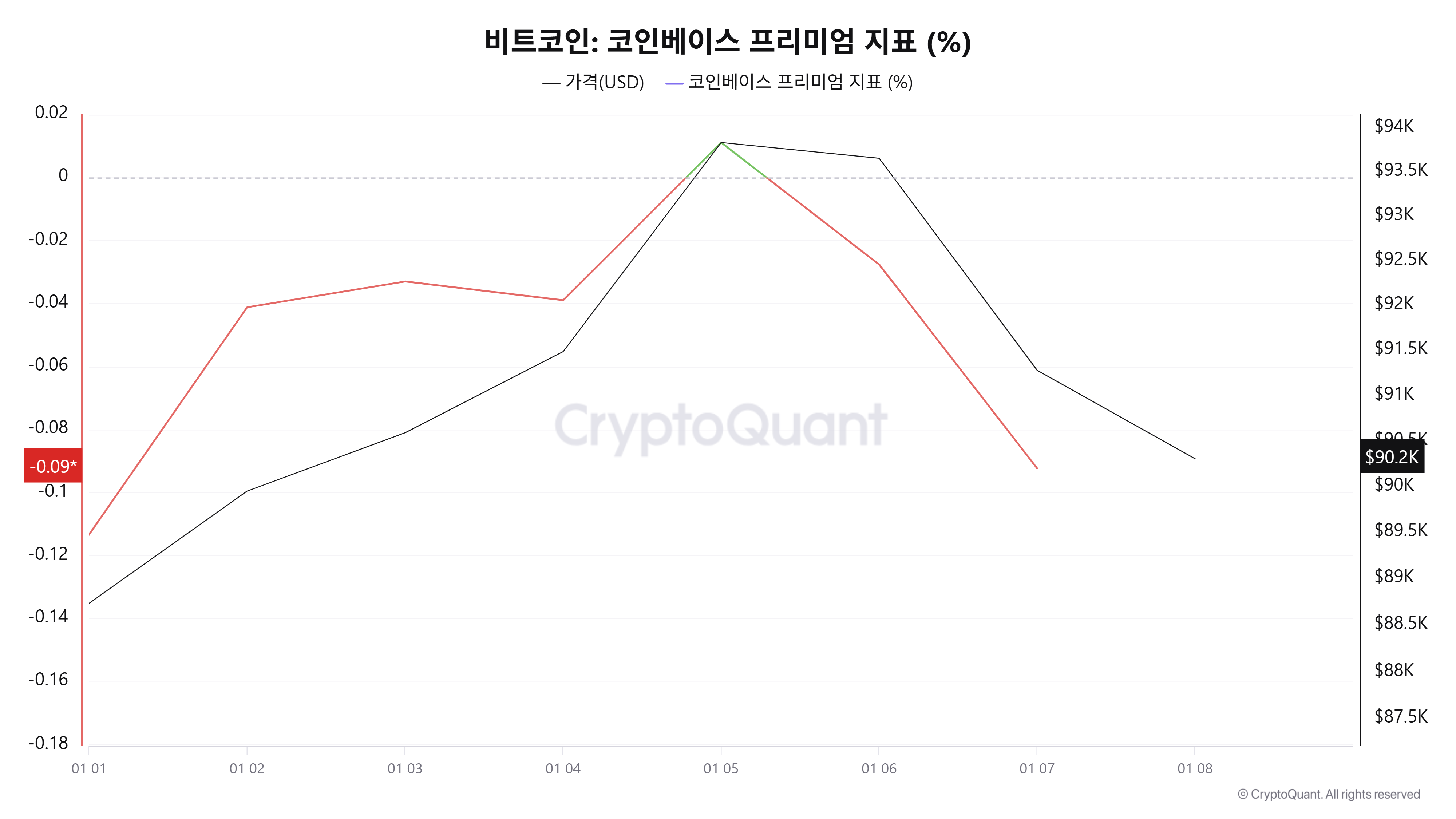 비교 기준으로 보면 프리미엄 지표는 1월 5일 0.0110%까지 회복되며 약 3주 만에 플러스 구간에 진입했으나, 이후 1월 6일 –0.0277%, 1월 7일 –0.0924%로 다시 마이너스 전환됐다. 가격 역시 1월 5일 9만3830달러 고점 이후 조정 흐름으로 돌아섰다.