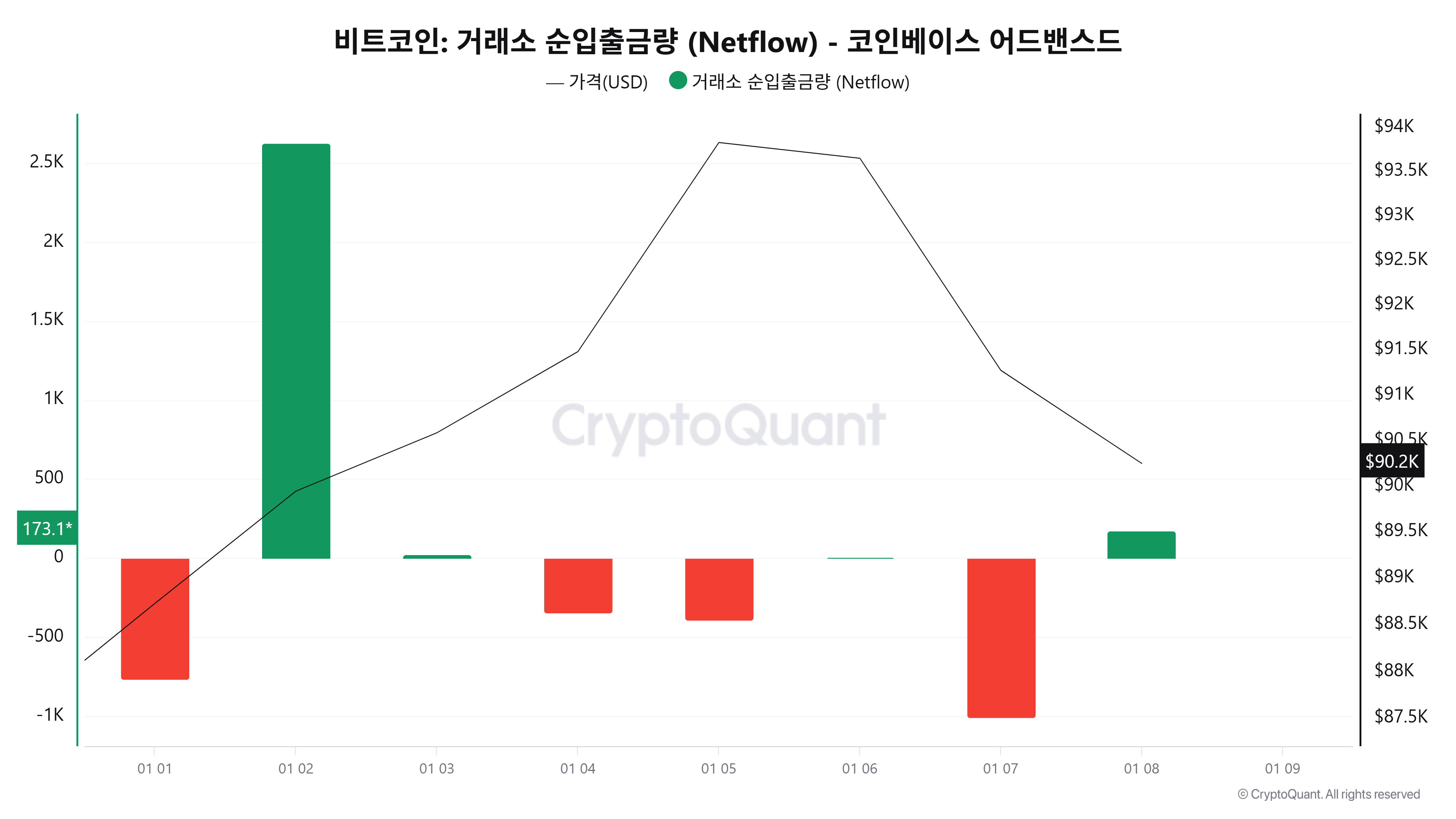 크립토퀀트 데이터에 따르면 1월 8일(UTC 기준, 미완결) 코인베이스 비트코인 순입출금은 +173.14BTC 순유입을 기록하며 전일 대규모 순유출 흐름을 뒤집었다.