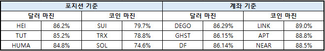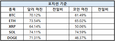 이더리움(ETH)은 달러 마진 70.30%, 코인 마진 78.87%를 기록했다. XRP는 달러 마진 77.00%, 코인 마진 81.78%로 집계됐다.