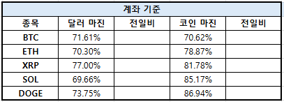 솔라나(SOL)는 달러 마진 69.66%, 코인 마진 85.17%를 나타냈다. 도지코인(DOGE)은 달러 마진 73.75%, 코인 마진 86.94%로 확인됐다.