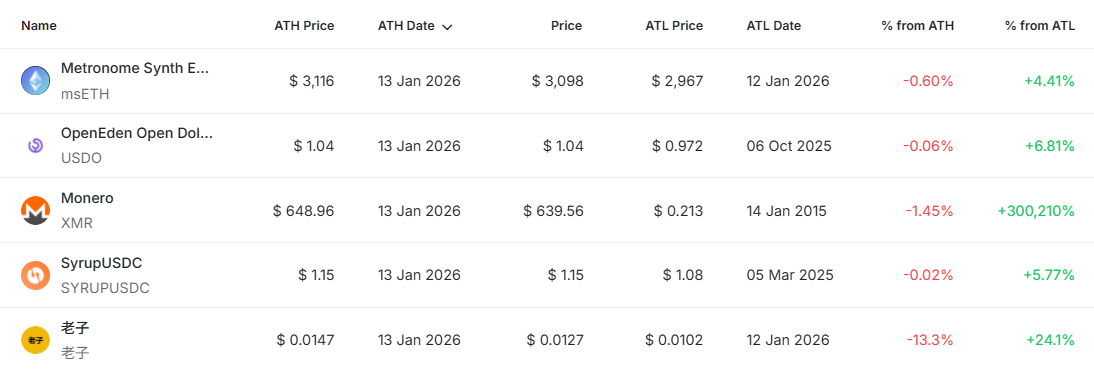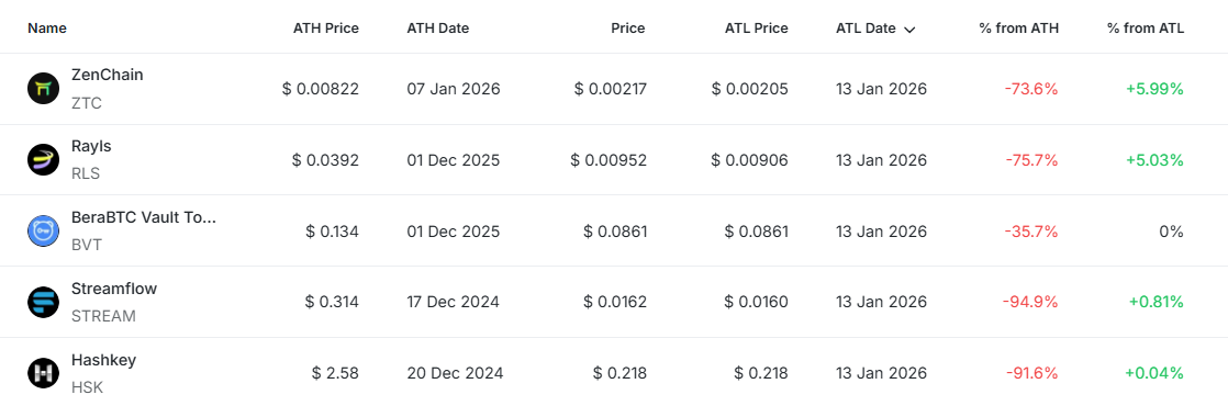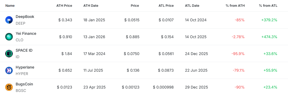[편집자주] 암호화폐 시장은 하루 새 고점과 저점이 빠르게 바뀌는 고변동성 환경이다. 역대 최고가(ATH)와 역대 최저가(ATL) 경신 종목을 추적하면 강세와 약세 흐름을 조기에 포착할 수 있다. 크립토랭크 기준 시가총액 1000만 달러 이상 종목 중 하루 사이 고점 또는 저점을 경신한 주요 토큰을 정리하고 시가총액 상위 종목과 실시간 국내 인기 자산의 고점 대비 조정률을 함께 분석해 시장 회복 여력과 흐름을 진단한다.