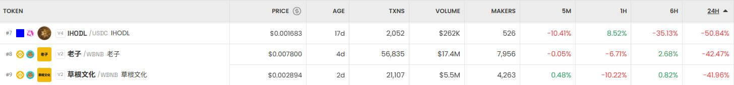 반면 가장 크게 하락한 거래쌍은 IHODL/USDC (IHODL)로 24시간 기준 -50.84%, 가격은 0.001683달러로 조정받았다. 老子/WBNB (老子) 역시 -42.47%를 기록했고, 草根文化/WBNB (草根文化)는 -41.96%로 하락세를 보였다.