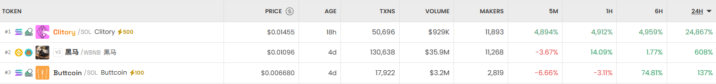 가장 크게 오른 거래쌍은 Clitory/SOL (Clitory)이다. 24시간 기준 24,867% 상승했으며, 가격은 0.01455달러로 기록됐다. 이어 黑马/WBNB (黑马)는 608% 오르며 0.01096달러에 거래됐고, Buttcoin/SOL (Buttcoin)은 137% 상승하며 0.006680달러를 나타냈다.