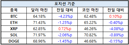 이더리움(ETH)은 달러 마진 71.43%로 전일 대비 -1.25%p 하락했으며, 코인 마진은 65.22%로 -0.40%p 감소했다. XRP는 달러 마진 62.85%로 0.72%p 증가한 반면, 코인 마진은 46.26%로 -4.08%p 하락했다.
