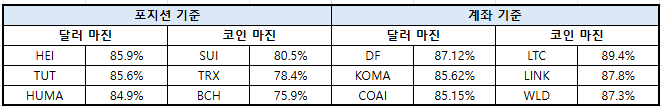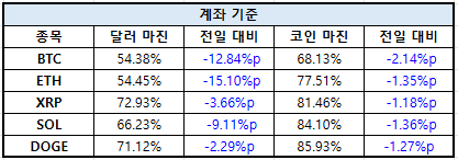 이더리움(ETH)은 달러 마진 54.45%로 -15.10%p 낮아졌으며, 코인 마진은 77.51%로 -1.35%p 감소했다. XRP는 달러 마진 72.93%로 -3.66%p 하락한 반면, 코인 마진은 81.46%로 -1.18%p 감소했다.