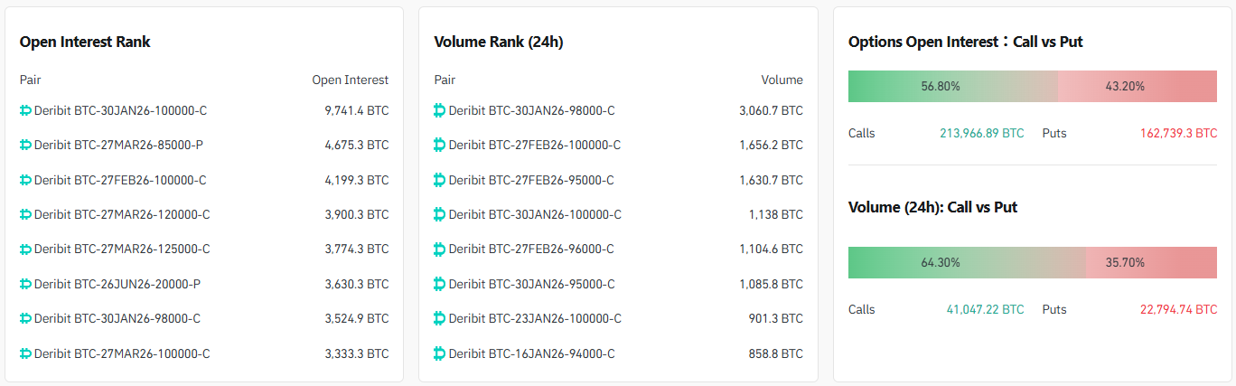 24시간 거래량 기준 상위 계약은 ▲9만8000달러 콜옵션(2026년 1월 30일) ▲10만 달러 콜옵션(2026년 2월 27일) ▲9만5000달러 콜옵션(2026년 2월 27일) 순으로 나타났다.