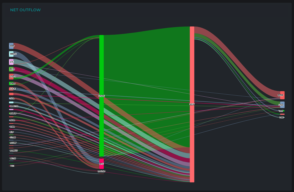 USD1에서는 총 2220만 달러의 자금이 나가 USDT로 1450만 달러, USDC로 770만 달러가 이동했다. XMR에서도 1270만 달러가 유출됐고 이 중 BTC로 1110만 달러가 움직였다.