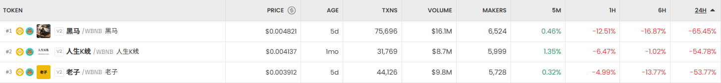 반면 가장 크게 하락한 거래쌍은 黑马/WBNB (黑马)로 24시간 기준 -65.45%, 가격은 0.004821달러로 조정받았다. 人生线/WBNB (人生线) 역시 -54.78%를 기록했고, 老子/WBNB (老子)는 -53.77%로 하락세를 보였다.