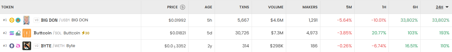 가장 크게 오른 거래쌍은 BIG DON/USD (BIG DON)이다. 24시간 기준 33,802% 상승했으며, 가격은 0.01992달러로 기록됐다. 이어 Buttcoin/SOL (Buttcoin)은 193% 오르며 0.01821달러에 거래됐고, BYTE/WETH (Byte)는 110% 상승하며 0.0003352달러를 나타냈다.