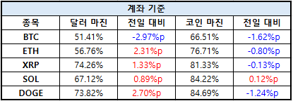 이더리움(ETH)은 달러 마진 56.76%로 2.31%p 상승했으며, 코인 마진은 76.71%로 -0.80%p 감소했다. XRP는 달러 마진 74.26%로 1.33%p 상승한 반면, 코인 마진은 81.33%로 -0.13%p 하락했다.