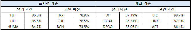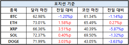 이더리움(ETH)은 달러 마진 73.01%로 전일 대비 1.58%p 상승했으며, 코인 마진은 65.49%로 0.27%p 증가했다. XRP는 달러 마진 66.36%로 3.51%p 증가한 반면, 코인 마진은 40.39%로 -5.87%p 하락했다.