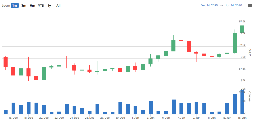 전일 대비 거래량이 추가로 늘어나면서, 가격 변동 구간에서 기관 투자자 중심의 거래 참여가 계속 확대되고 있음을 시사한다. 특히 단기 방향성 탐색 국면에서도 대량 주문이 꾸준히 유입되며, 시장 전반의 유동성과 변동성이 동시에 유지되고 있는 모습이다.