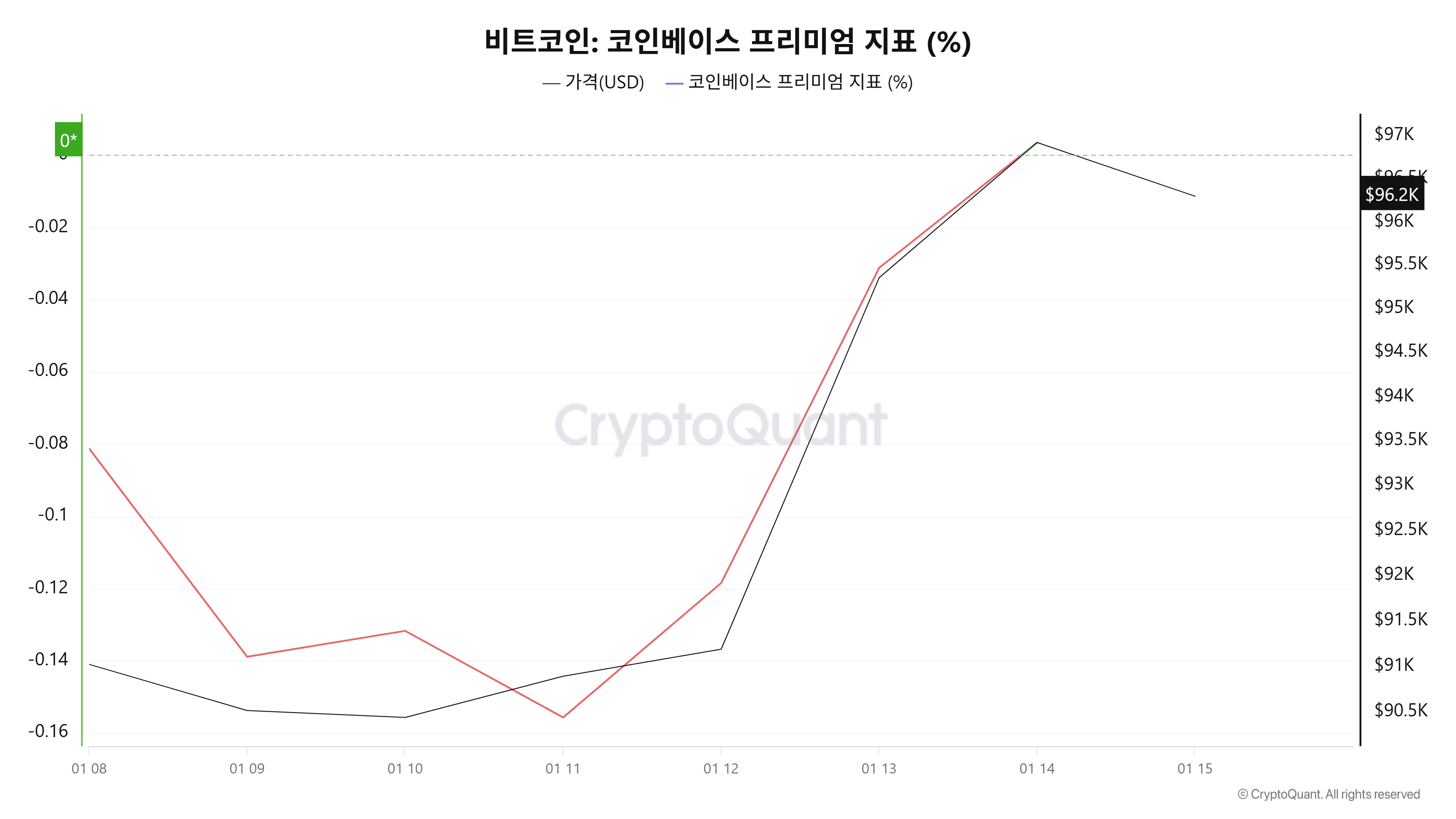 크립토퀀트 데이터에 따르면 1월 14일(UTC 기준) 코인베이스 프리미엄 지표는 +0.003%를 기록했다. 장기간 이어졌던 마이너스 흐름에서 소폭이나마 플러스 전환이 나타나며 미국발 현물 수요가 극히 제한적인 수준에서 재유입 조짐을 보인 것으로 해석된다.