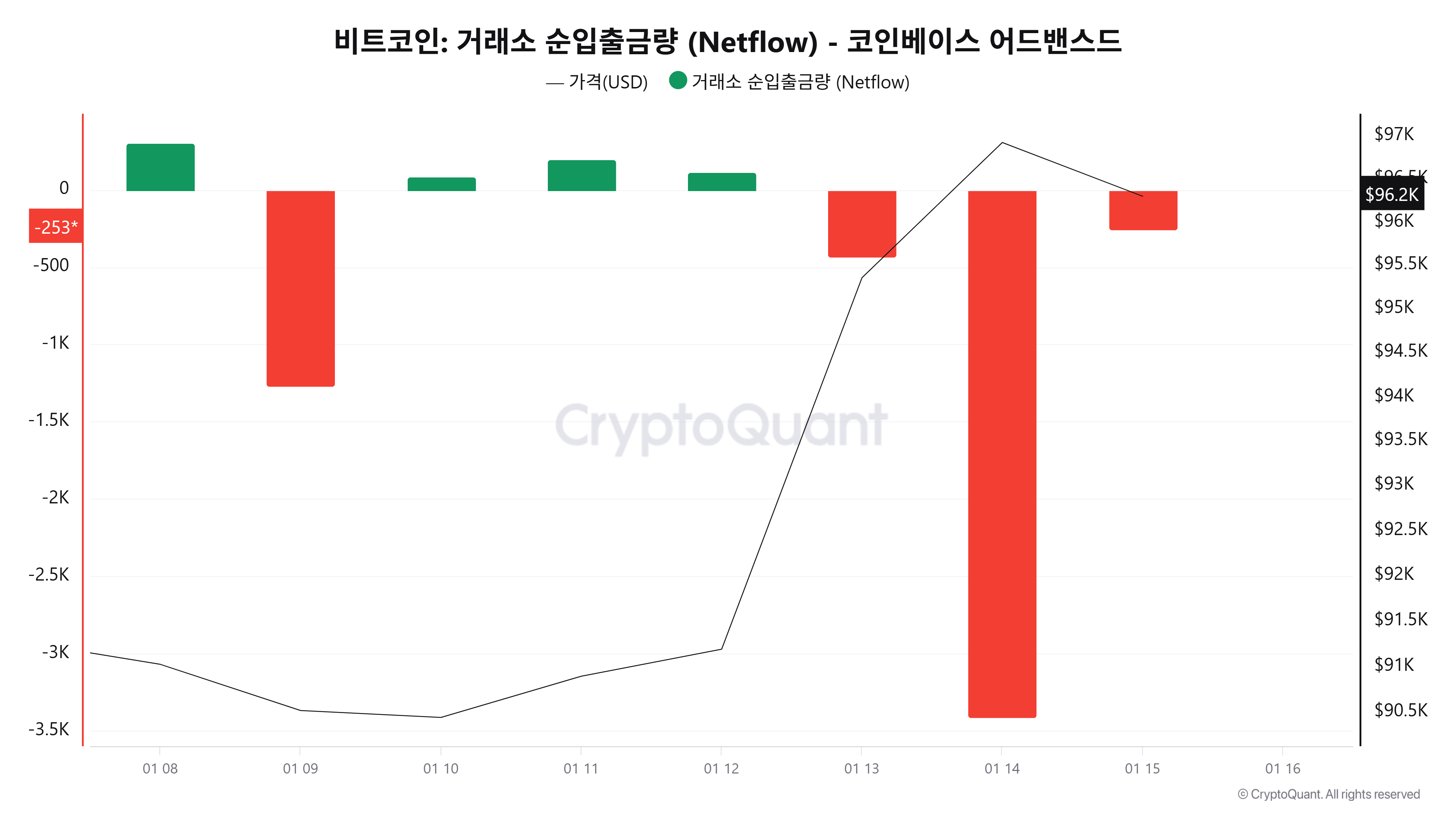 크립토퀀트 데이터에 따르면 1월 15일(UTC 기준, 미완결) 코인베이스 비트코인 순입출금은 –253BTC 순유출을 기록했다. 전일에 이어 유출 흐름이 이어지며 단기적으로는 거래소 외부로의 이동 흐름이 유지되는 모습이다.
