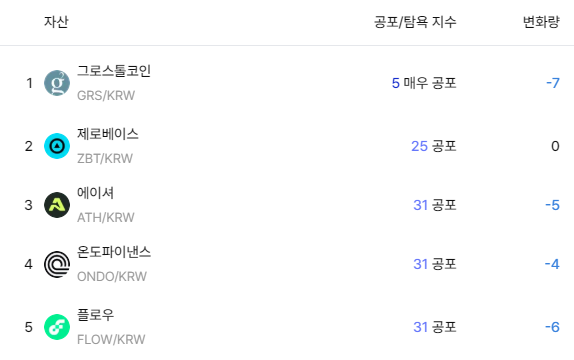 업비트 기준 그로스톨코인은 공포·탐욕 지수 6을 기록하며 ‘매우 공포’ 단계로 분류됐다. 이는 해당 지표에 포함된 자산 가운데 가장 낮은 수준으로, 전일 대비 7포인트 하락했다. 같은 지표 상위에는 제로베이스(ZBT), 에이셔(ATH), 플로우(FLOW), 온도파이낸스(ONDO) 등이 이름을 올렸다.