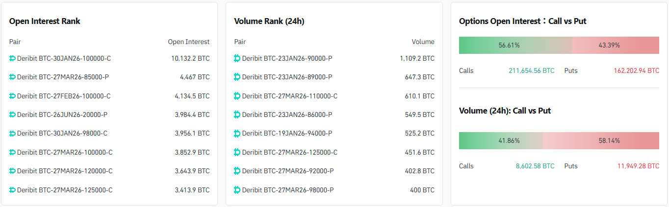 24시간 거래량 기준 상위 계약은 ▲9만 달러 풋옵션(2026년 1월 23일) ▲8만9000달러 풋옵션(2026년 1월 23일) ▲11만 달러 콜옵션(2026년 3월 27일) 순으로 나타났다.