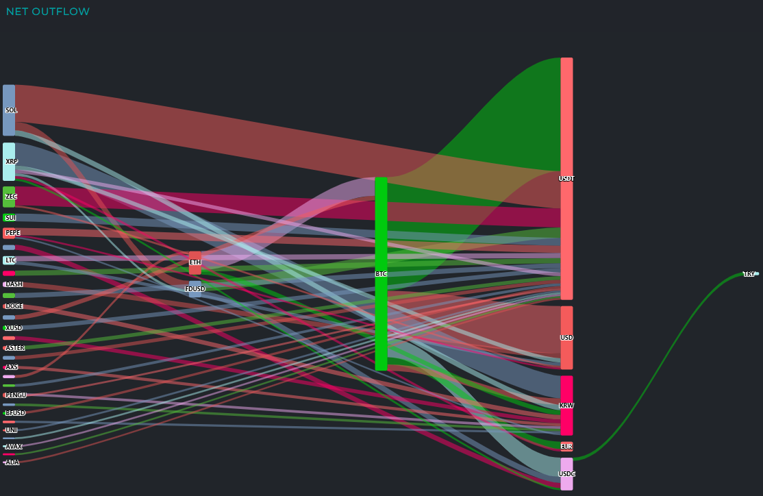 자금 유출 흐름을 보면 BTC에서 1억8600만 달러 규모의 유출이 발생했다. 이 가운데 1억890만 달러가 USDT로 이동했고, 4570만 달러는 달러화(USD), 1850만 달러는 USDC, 720만 달러는 유로화(EUR), 600만 달러는 원화(KRW)로 분산되며 현금화와 스테이블코인 전환이 동시에 나타났다.