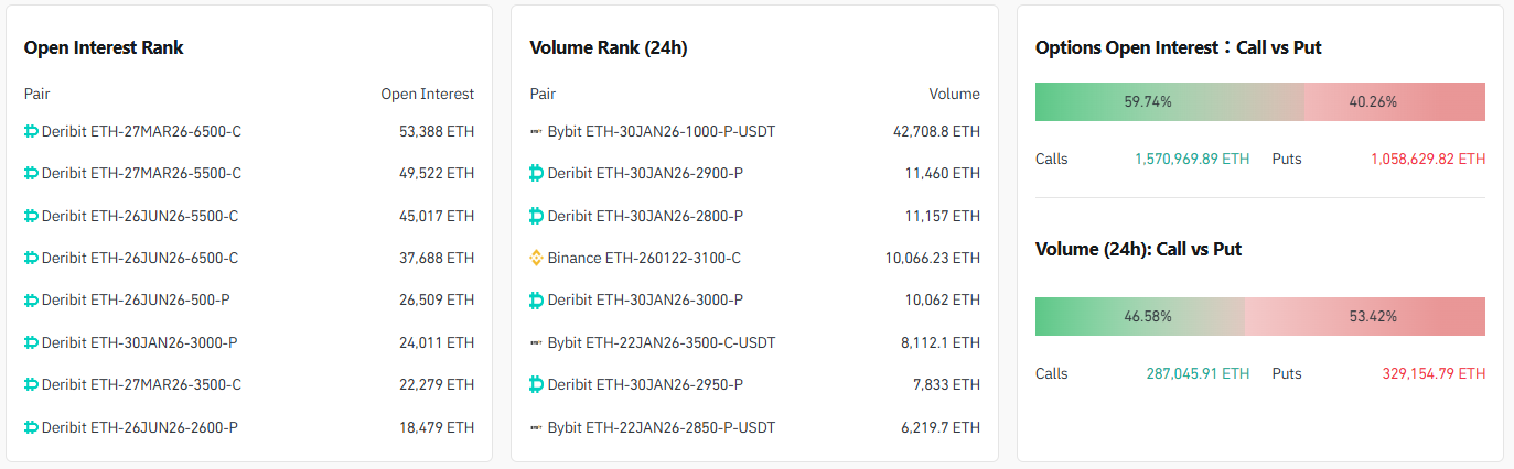 24시간 거래량 기준 상위 계약은 ▲1000달러 풋옵션(2026년 1월 30일·바이비트) ▲2900달러 풋옵션(2026년 1월 30일·데리비트) ▲2800달러 풋옵션(2026년 1월 30일·데리비트) 순으로 나타났다.