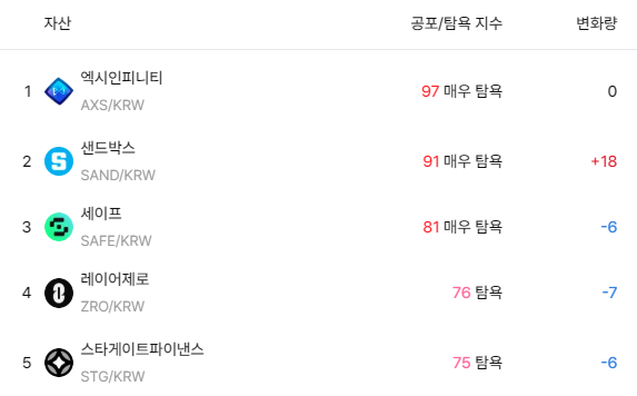 공포·탐욕 지수 상위권에는 엑시인피니티(AXS)가 97로 1위를 기록했고, 샌드박스가 2위에 올랐다. 이 밖에 세이프(SAFE), 레이어제로(ZRO), 스타게이트파이낸스(STG) 등이 뒤를 이었다.