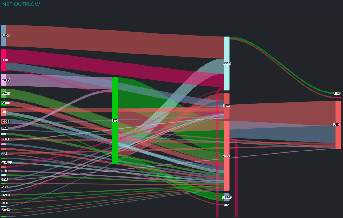 자금 유출 흐름을 보면 BTC에서 총 1억2160만 달러 규모의 유출이 발생했다. 이 가운데 4430만 달러가 USDT로 이동했고, 3460만 달러는 달러화(USD), 2120만 달러는 USDC, 1050만 달러는 원화(KRW), 980만 달러는 FDUSD로 분산되며 현금화와 스테이블코인 전환이 동시에 나타났다.