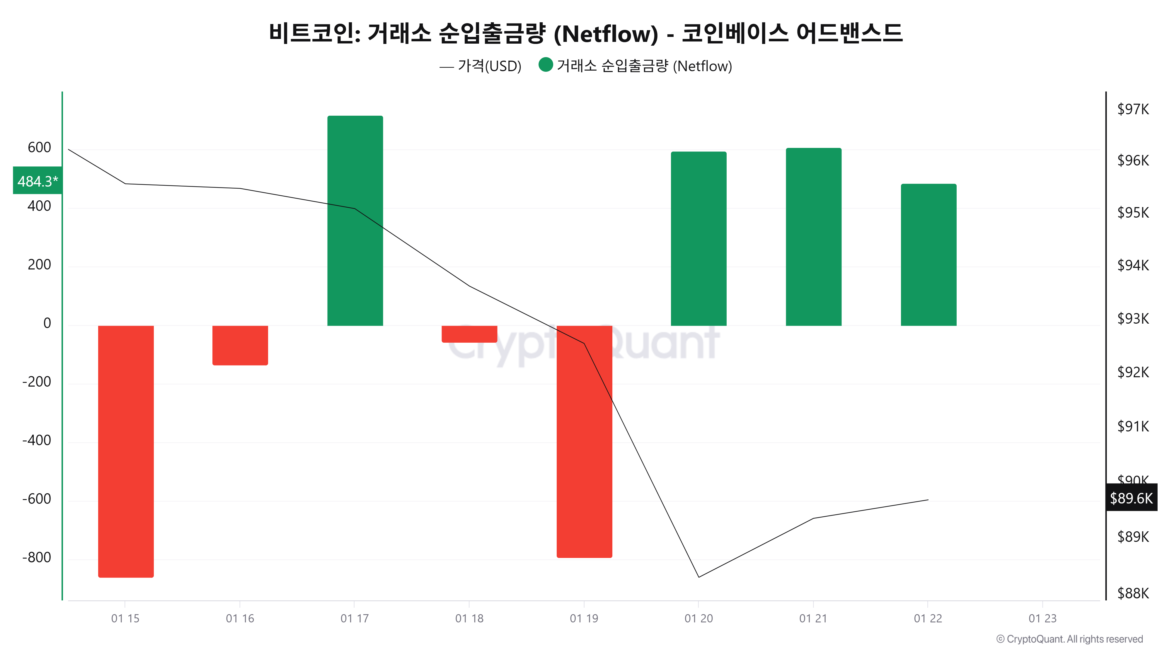 크립토퀀트 데이터에 따르면 1월 22일(UTC 기준, 미완결) 코인베이스 비트코인 순입출금은 +484BTC 순입금을 기록했다. 최근 이어졌던 유출 흐름이 멈추고 다시 거래소로의 유입이 나타나며 단기적으로는 매도 대기 물량이 일부 증가한 모습이다.