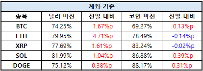 솔라나(SOL)는 달러 마진 81.99%로 전일 대비 1.04%p 상승했고, 코인 마진은 86.88%로 0.39%p 증가했다. 도지코인(DOGE)은 달러 마진 75.12%로 0.38%p 상승했으며, 코인 마진은 88.17%로 0.31%p 증가했다.