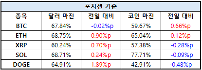 포지션 기준에서 비트코인(BTC)의 롱 포지션 비중은 달러 마진 67.84%로 전일 대비 0.02%p 감소했으며 코인 마진은 59.67%로 0.66%p 증가했다.