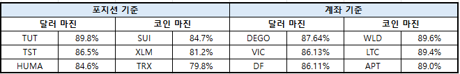 이더리움(ETH)은 달러 마진 79.95%로 전일 대비 4.71%p 크게 증가한 반면, 코인 마진은 78.49%로 0.14%p 감소했다. XRP는 달러 마진 77.69%로 1.61%p 상승했고, 코인 마진은 83.24%로 0.02%p 소폭 하락했다.